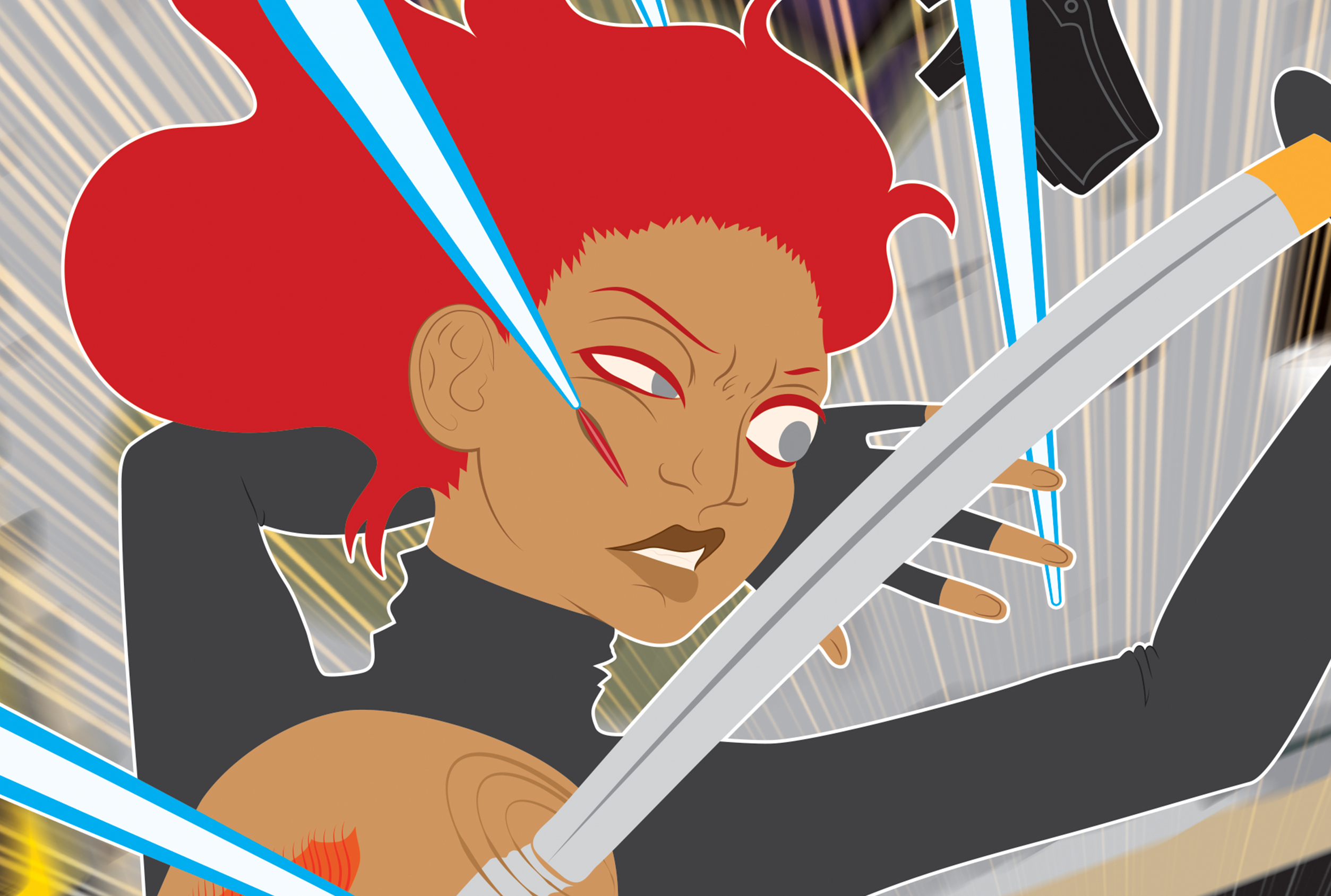 Quick and precise, it would also get the gun out of his hands. She reached around her back, her hand sinking into her own skin to pull out her sword. What seemed to be a large intricate tattoo on her skin, served to be weapon concealer, a benefit for her to keep the extra weight off her small frame.