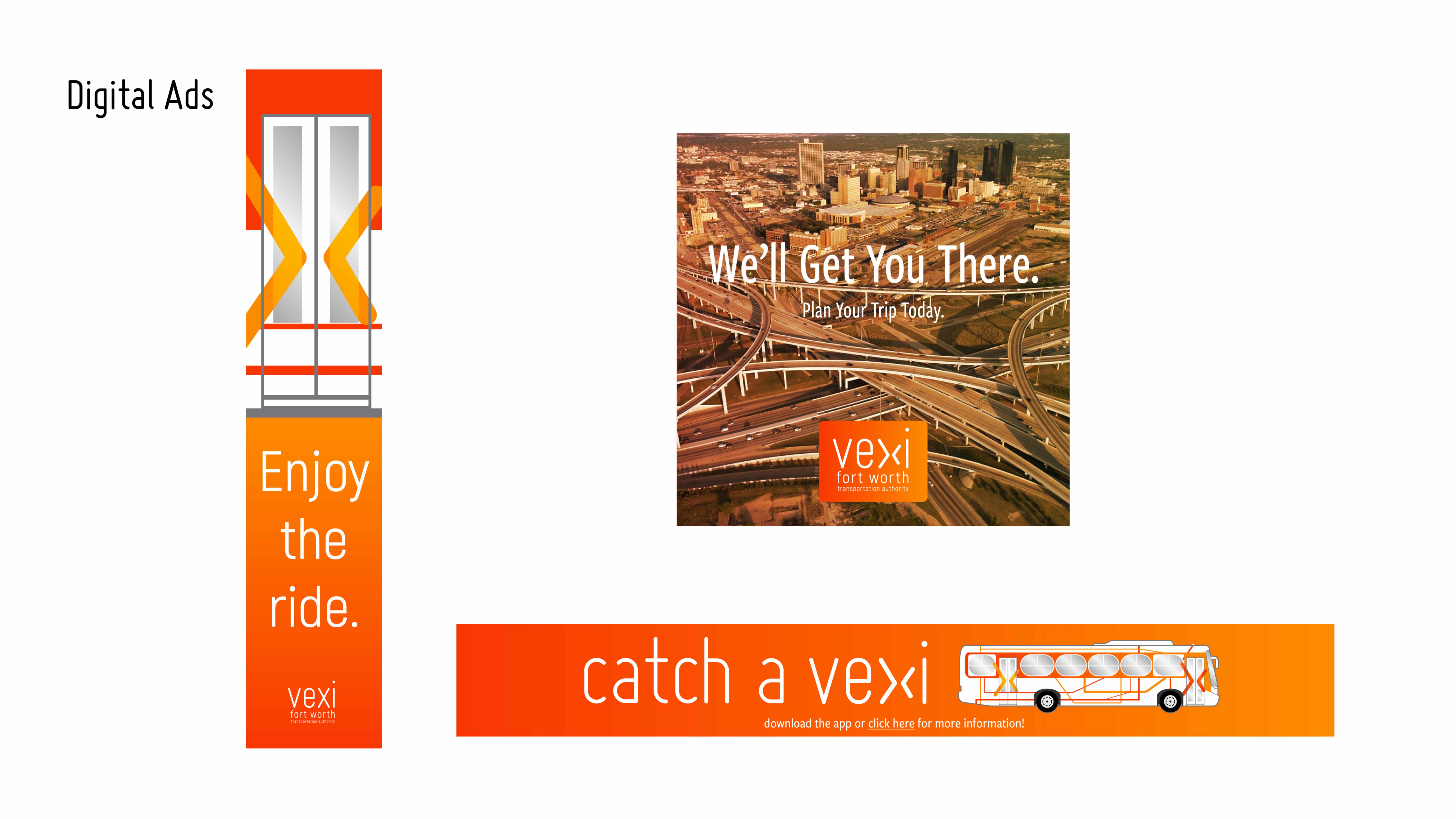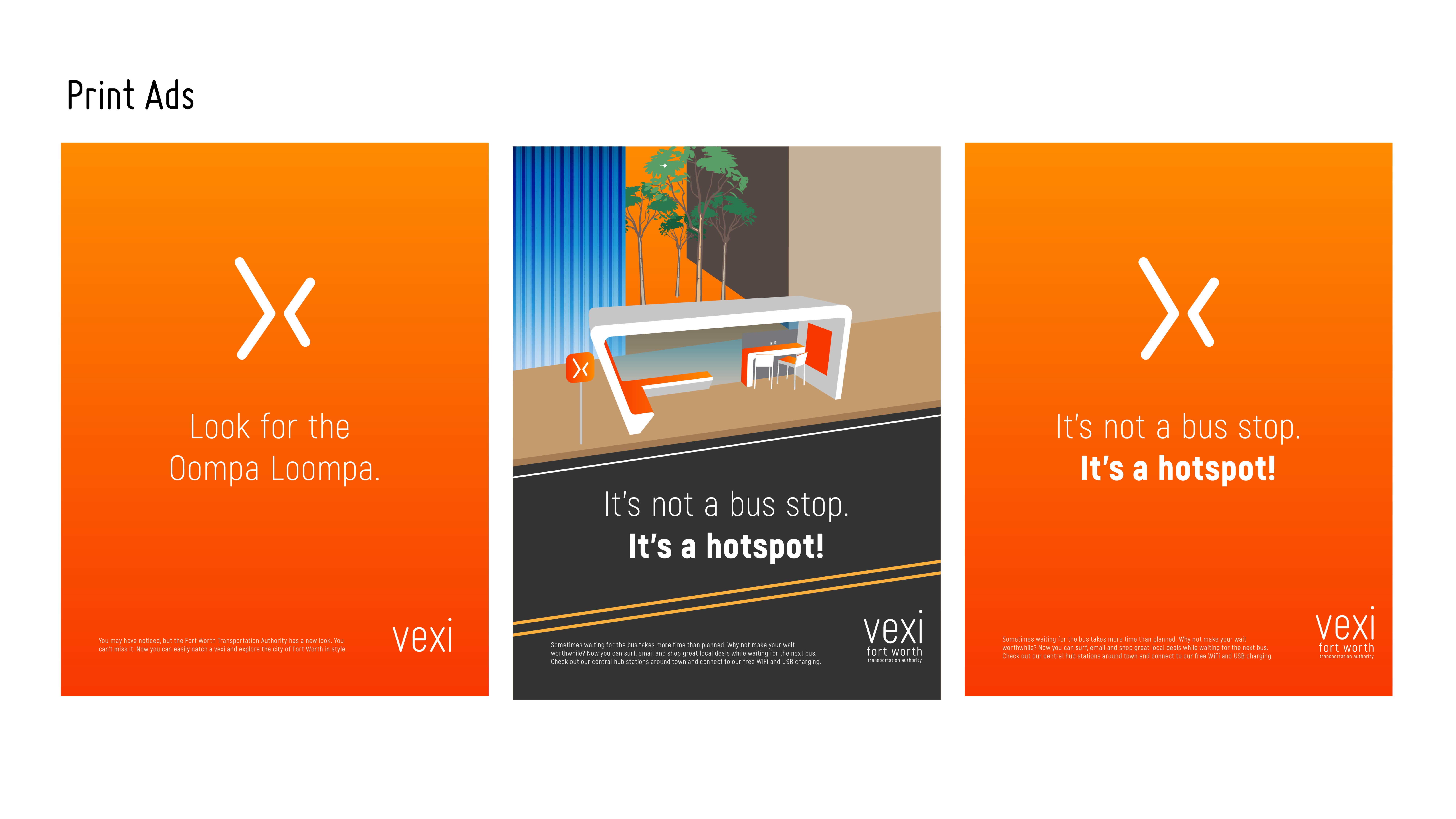 Solution: Vexi, a derivative of the Latin term "evexi" meaning "to carry away, convey out or ride" and a play-on-words of taxi, is the new identity for "The T." It features a clean modern design, utilizing bright colors and graphics to intrigue the target audience to take advantage of the economical transportation system. Vexi also seeks to connect users to work, play, entertainment, shopping, etc. by providing covered bus stops and featured hub locations with hot spots to accommodate users’ needs